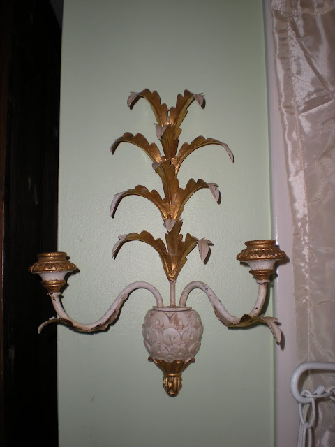 This is my new antique hand carved wood and gilded tole Italian sconce. I got this at a yard sale a few weeks ago for a whopping $0.50 cents!