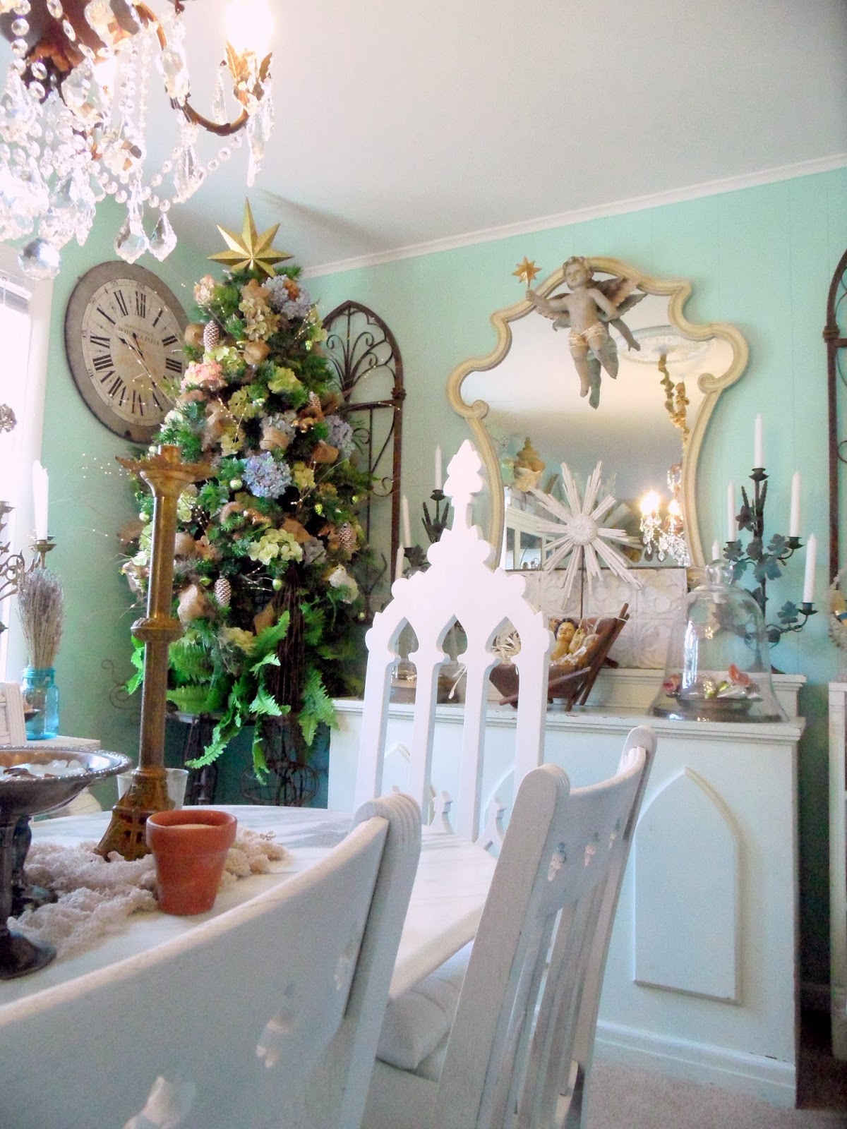 . . .And filled a crystal chandelier basket with mercury glass ornaments.